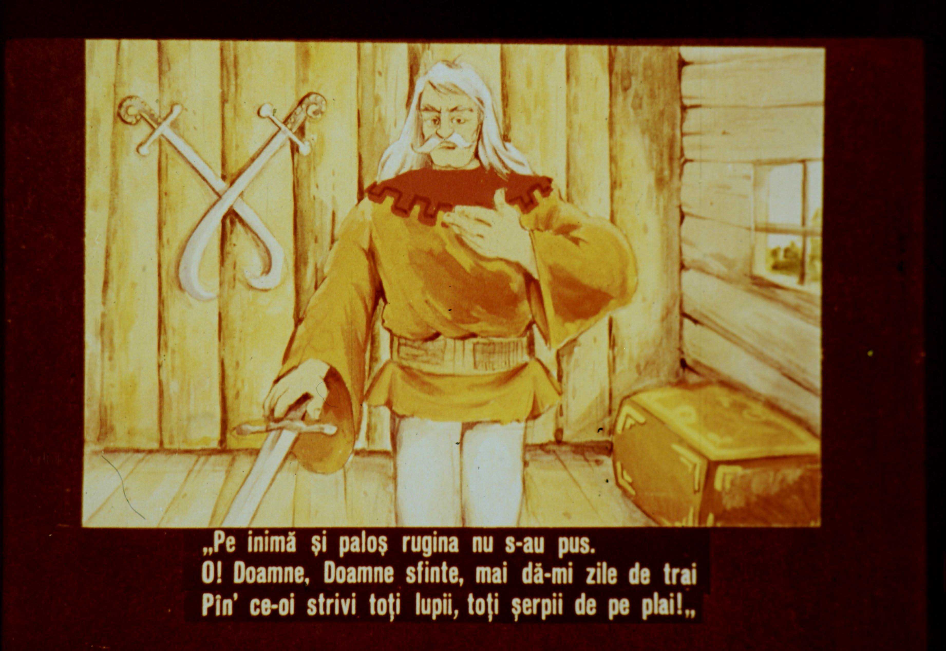 Un bătrân în haine tradiționale desprinde un palos din cui, iar arma strălucește în mâna sa.
