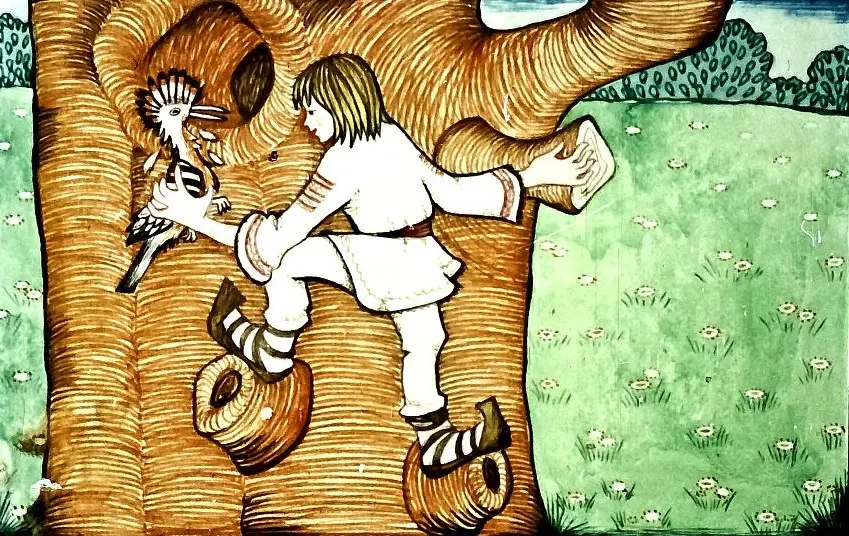 …mă abat iar pe la teiu, ma suiu într-însul… Atunci ieu lespedea cu îngrijire, bag mâna și scot pupăza vlăguita de atâta zbucium;