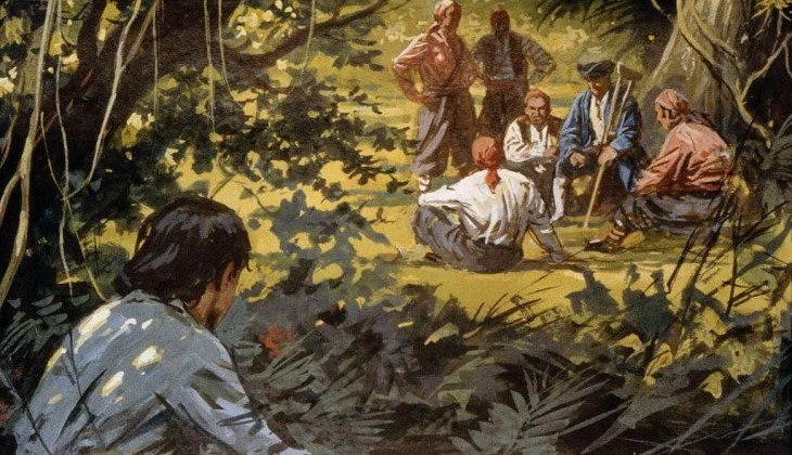 Soon Jim leaves for the island. He follows Silver. He finds them talking in a small clearing. He hears a sharp dispute. The next moment Silver lifts his crutch and attacks Tom. It seems that the sailor does not want to join the gang.